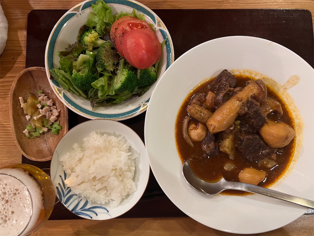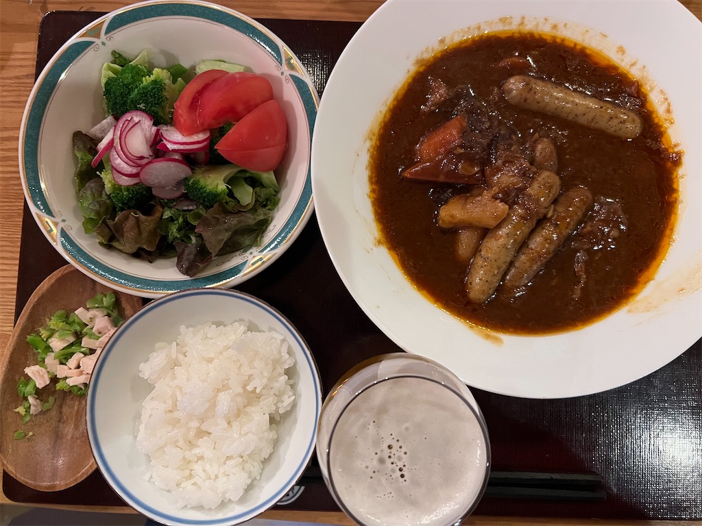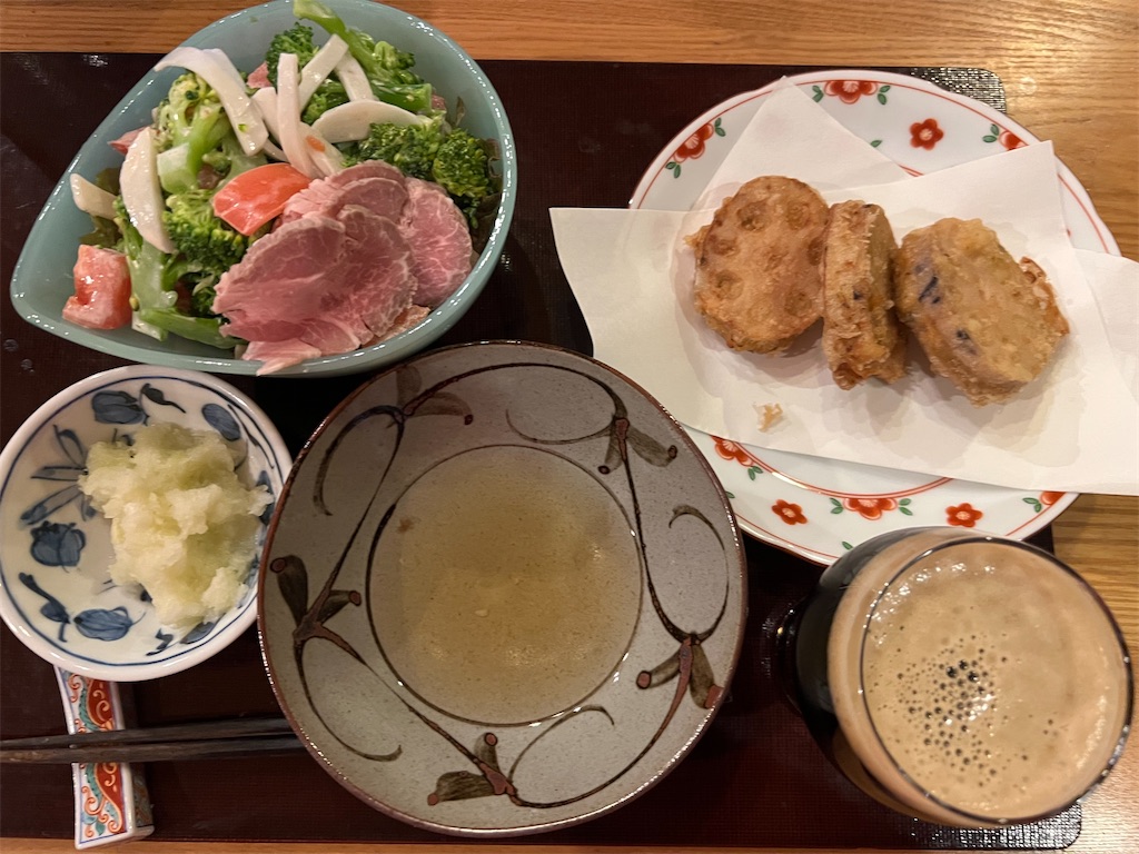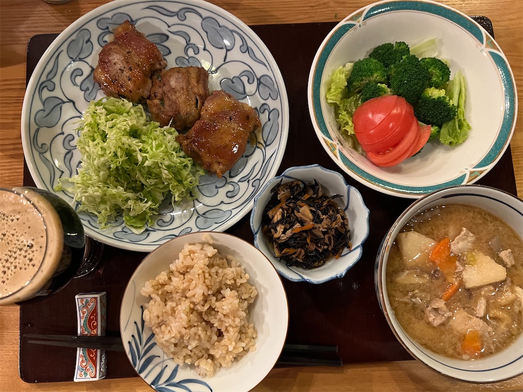 今日は里芋の豚肉包み焼き、豚汁、ひじきの煮物、サラダ