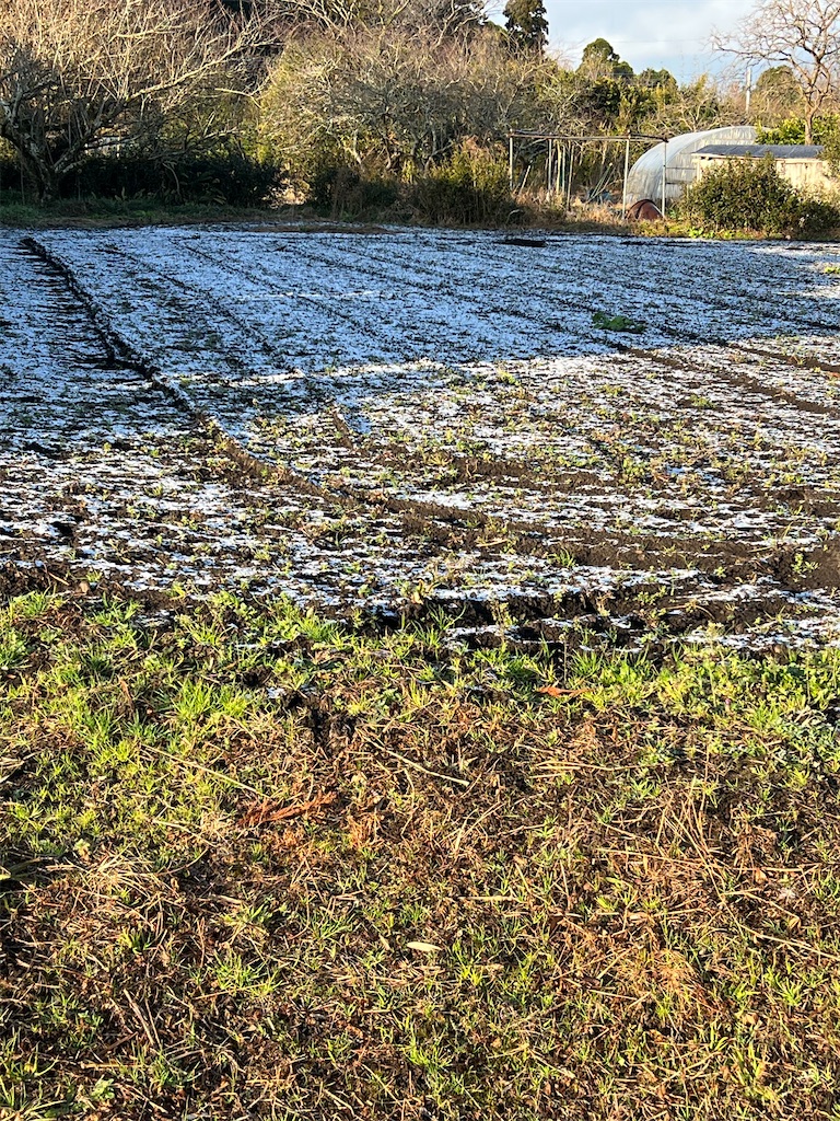 が、菜園に転がっていた日陰のプラスチックボウルの水がかなり厚く凍っていて昼過ぎても溶けず