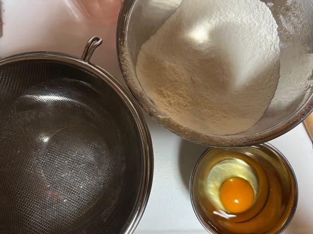 いつもは新しいポリ袋を計りにのせて、袋の中に材料を投入して、たっぷり空気を入れて捻って、フリフリしてふるうのを省略するのですが