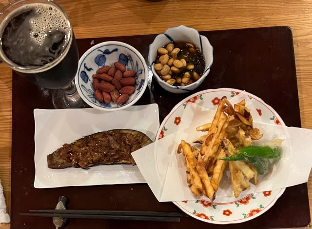夕食は、日曜日に買ったお蕎麦と、さつま芋の天ぷら、茄子を焼いて豚味噌たっぷり