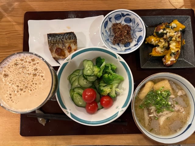 今日の夕食は、豚汁、鯖の干物、カボチャのバジルチーズ焼き、サラダ、豚味噌、白ごはんなど