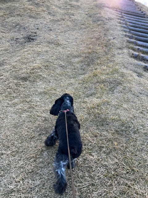 ベス🐕🦺に引かれながら、芝生の傾斜を登った昨日の夕方の散歩