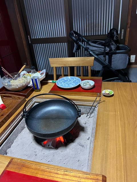 囲炉裏で炭をおこして
