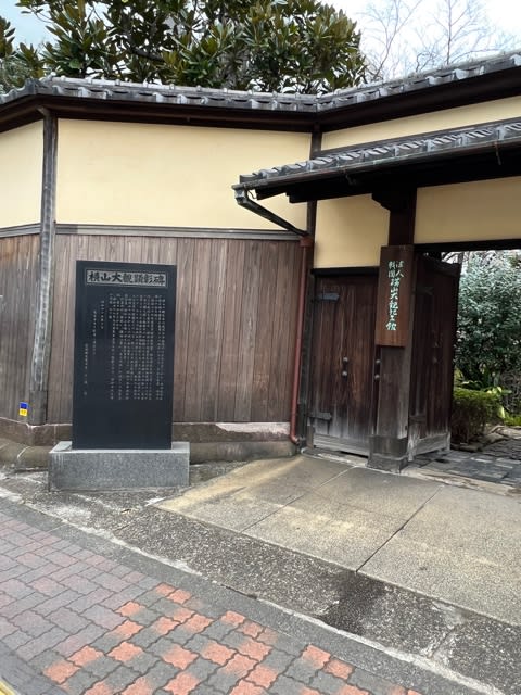不忍池に面して漆喰と木の重厚な壁と門構えの記念館の入り口