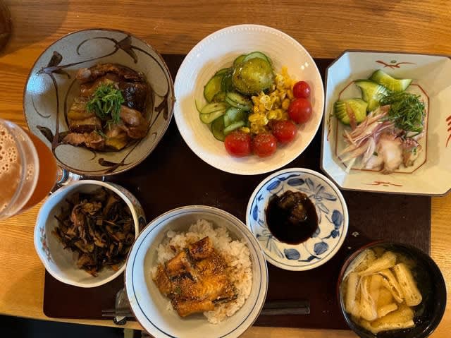 ○ 火曜日は、ナスと豚肉の味噌炒め煮、サラダ、ヒジキの煮物、鰻の蒲焼の小丼、味噌汁