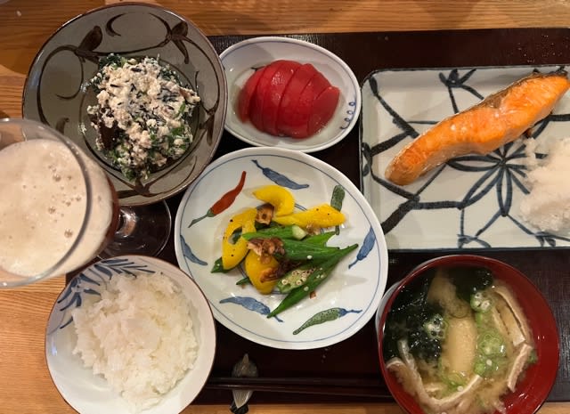 ○ 木曜日は、塩しゃけ焼いてほうれん草の白和え、オクラとパプリカのニンニクソテー、トマト、ご飯、味噌汁