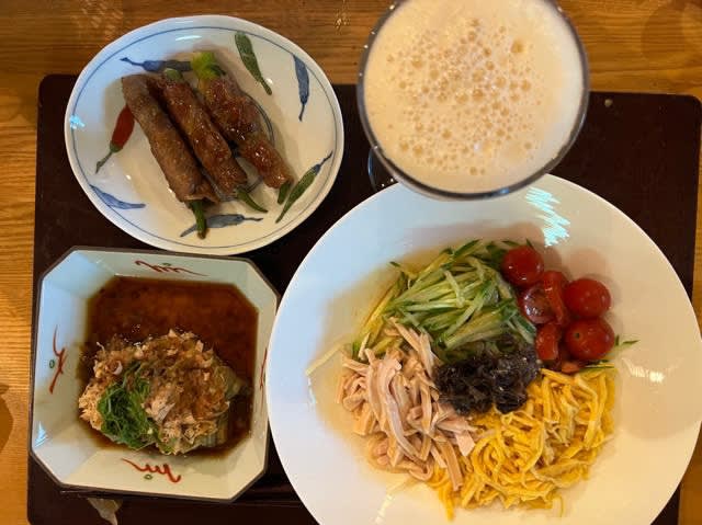 ○ 昨日の夕食は、冷やし中華とオクラの梅シソ巻きソテー、焼きナス