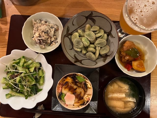 他は冷凍そら豆を塩茹でして、残り物の蓮根の白和えと