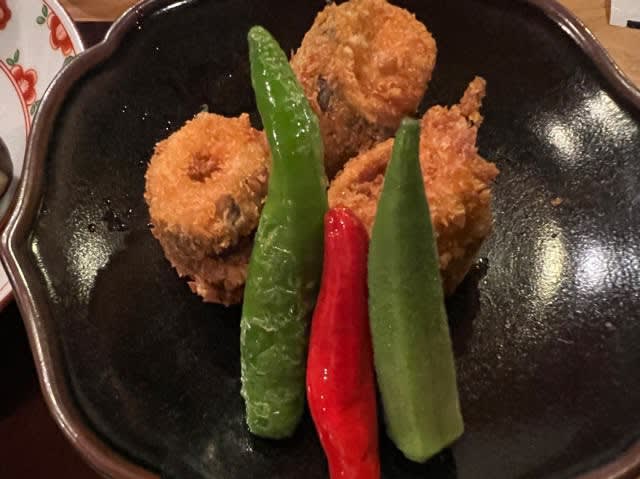 鰯のロールフライには万願寺とうがらしの素揚げと茹でたオクラ添えて