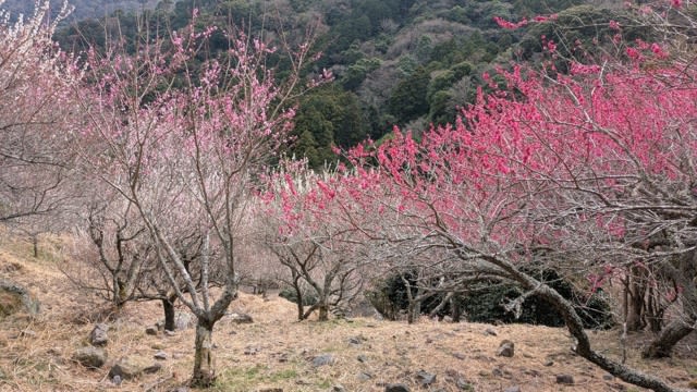 送迎バスを降りてから、しばらく緩やかな坂を歩いていくと、幕山の麓の梅林が目に入ってきました