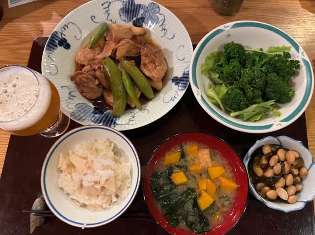 筍ご飯、鶏肉と筍の甘酢炊き、味噌汁、大豆と昆布の煮物