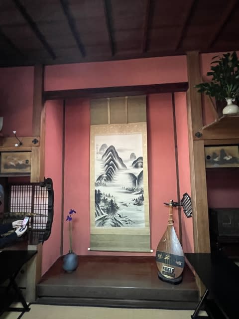 400年の歴史のある建物で、殿様が泊まった部屋ということで、本書院作り、壁は薩摩ベンガラ・・・・独特な赤い漆喰壁