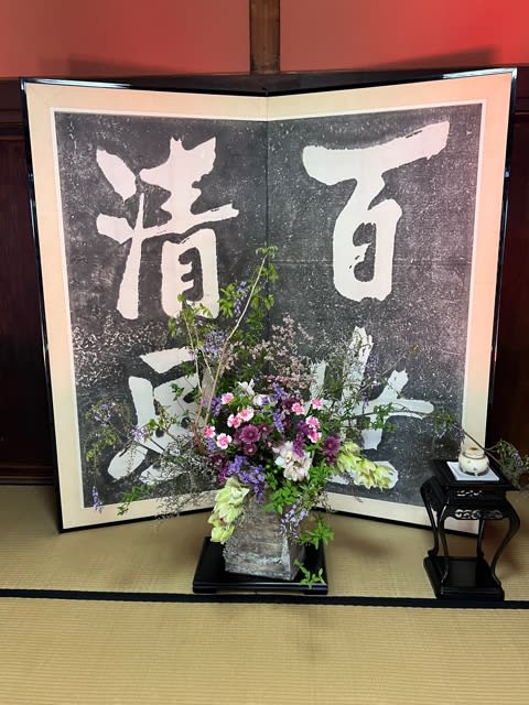 時間になり、茶室に入ると立礼の室礼が二間続きの和室を一つにして作ってある