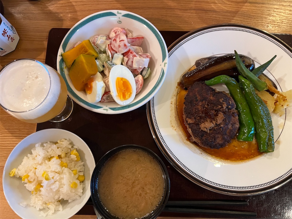 ハンバーグの付け合わせは、茄子、万願寺とうがらし、じゃがいも、オクラ