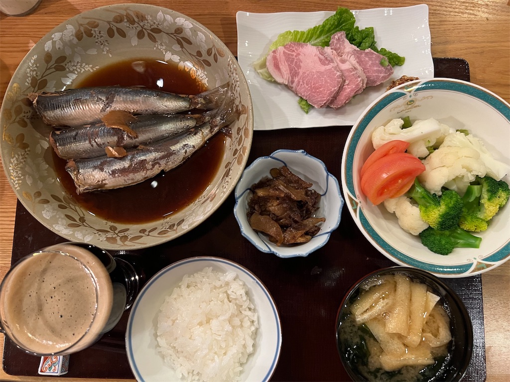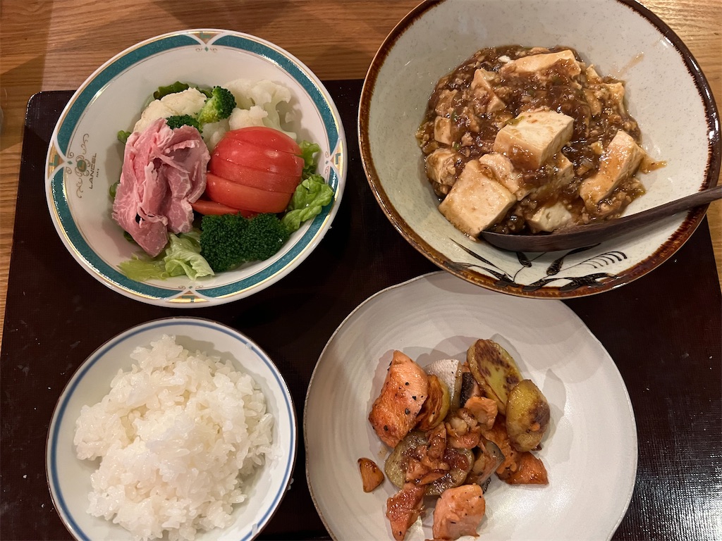 ○ 夕食は麻婆豆腐と鮭とジャガイモのソテー、バター醤油味、サラダにはローストポーク