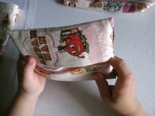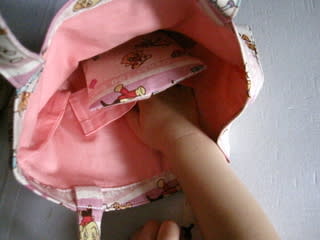 出来上がったトートのティッシュ入れも入れて ポケットの調子を確認して喜ぶ孫ちゃん2