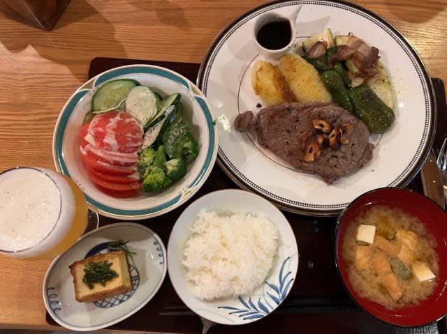 付け合わせの野菜はズッキーニ、椎茸、甘長とうがらし、ピーマンのソテー