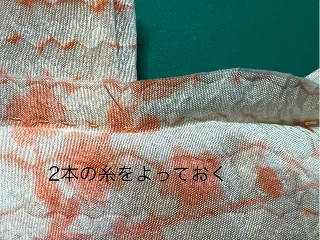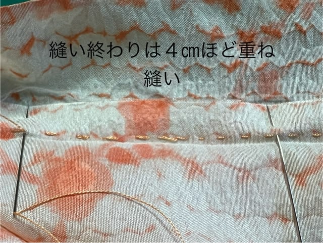 19 反対側は、解いた部分から縫い合わせていきますが、最初の4㎝ほどは重ね縫いでスタート