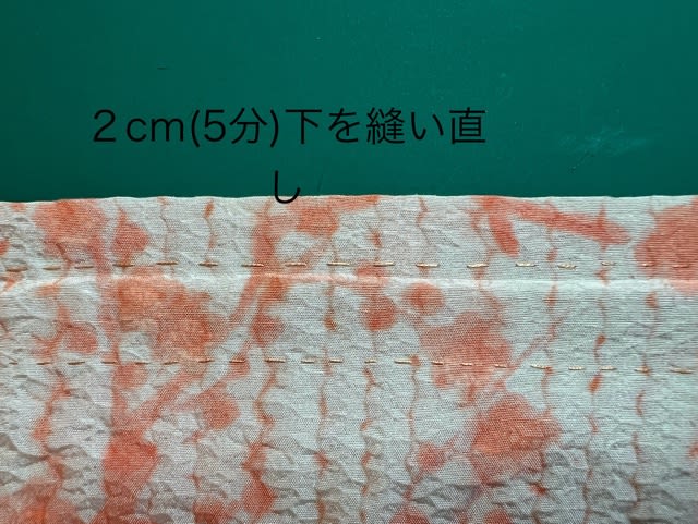5 最初の縫い目より2cmほど深い部分を、縫い直し(前身頃〜後身頃〜背中心を過ぎて、後身頃〜前身頃)