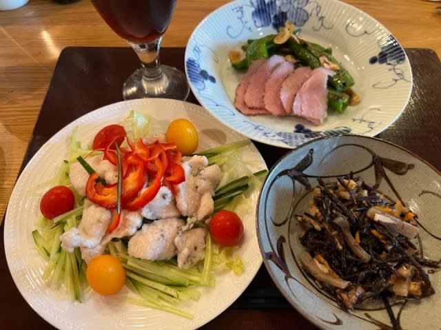 今夜は鶏胸肉を削ぎ切りにして、コーンスターチをつけて熱湯に潜らせてと、手間をかけて、喉越しのいい肉を使ったサラダ